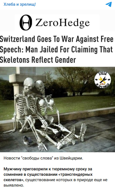 Російські телеграм-канали із посиланням на видання ZeroHedge стверджують, нібито у Швейцарії чоловіка засудили до 10 днів ув’язнення за коментар у фейсбуці. У ньому він висловив сумнів щодо того, що «скелети можуть бути трансгендерними».