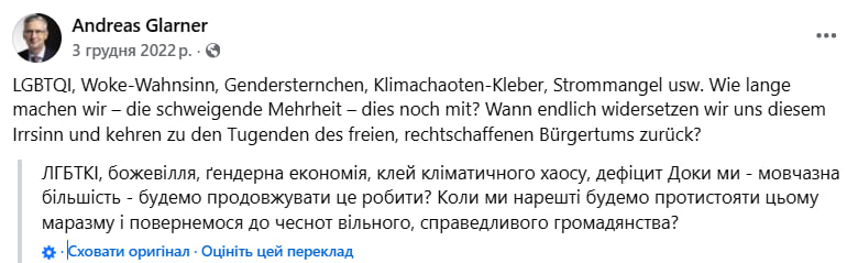 Скриншот допису Андреаса Гларнера у фейсбуці (автоматичний переклад)