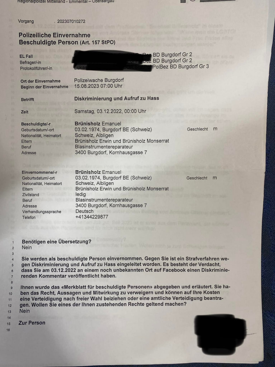 У 2023 році за цей коментар чоловіка притягнули до відповідальності за Статтею 261bis Кримінального кодексу Швейцарії про дискримінацію та розпалювання ненависті.