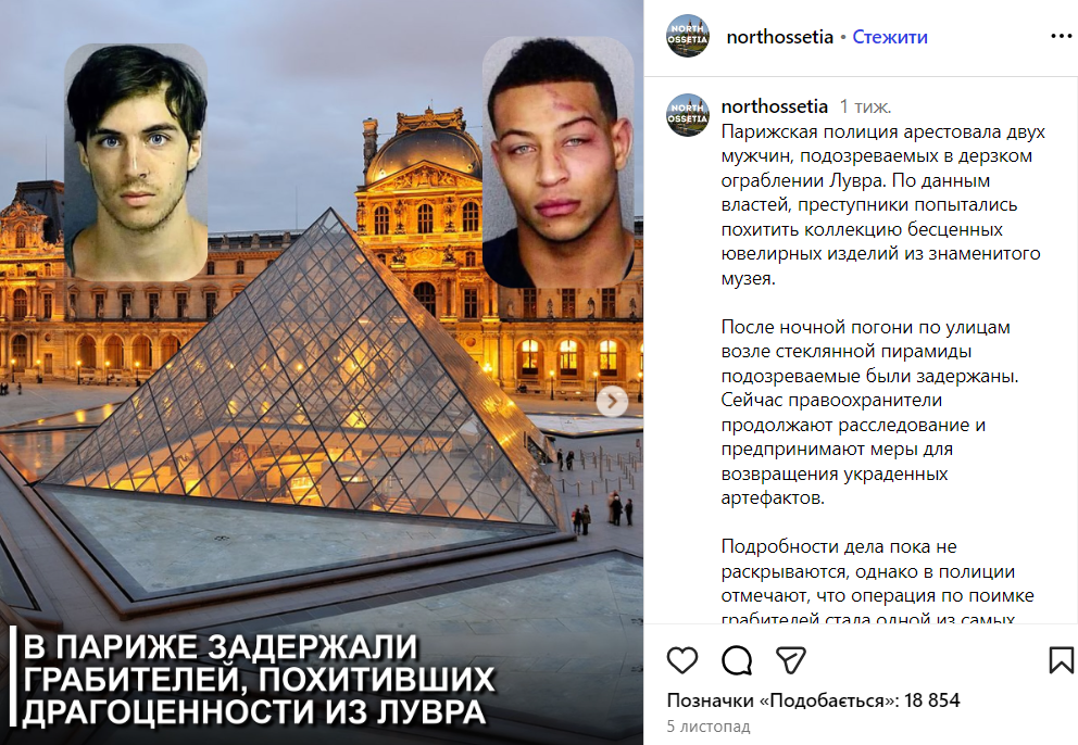 Однак це маніпуляція. Чоловіки на поширених фото не мають стосунку до пограбування Лувру, французькі правоохоронці взагалі не публікували фото затриманих підозрюваних.