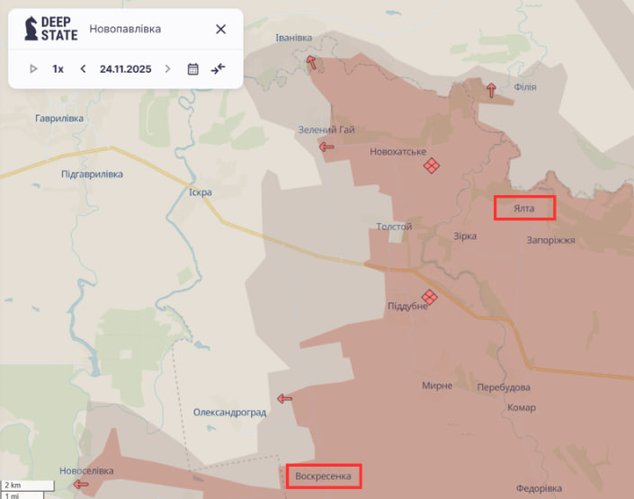 До того ж автори використали стару інформацію та подали як свіжу новину. Ще у липні 2025 року 20 армійський корпус повідомив, що бійці 31 окремої механізованої бригади та 505 окремого батальйону морської піхоти встановили свої бойові стяги у Воскресенці та Ялті. На той момент там тривали бойові дії. Нині ж, за даними DeepState, обидва населені пункти тимчасово окуповані.
