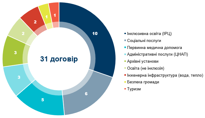Тематика договорів, зареєстрованих у січні, свідчить про зосередження міжмуніципального співробітництва передусім на забезпеченні базових соціальних послуг, в той час як угоди про інфраструктурні та розвиткові проекти майже не укладаються. Із 31 договору найбільша частка – 10 угод (32%) – стосується інклюзивної освіти й функціонування інклюзивно-ресурсних центрів. Ще 6 договорів (19%) спрямовані на соціальні послуги, зокрема спільне утримання центрів надання соціальних послуг, а 5 договорів (16%) – на первинну медичну допомогу. Таким чином, 21 із 31 договору (68%) зосереджені на соціально-освітніх і медичних функціях. Інші напрями співробітництва відіграють значно меншу роль. Адміністративні та «бек-офісні» функції, зокрема ЦНАПи та архіви, охоплюють 6 договорів (19%), тоді як інфраструктурні, безпекові та розвиткові напрями разом становлять лише 4 договори (13%), залишаючись допоміжними й точковими.