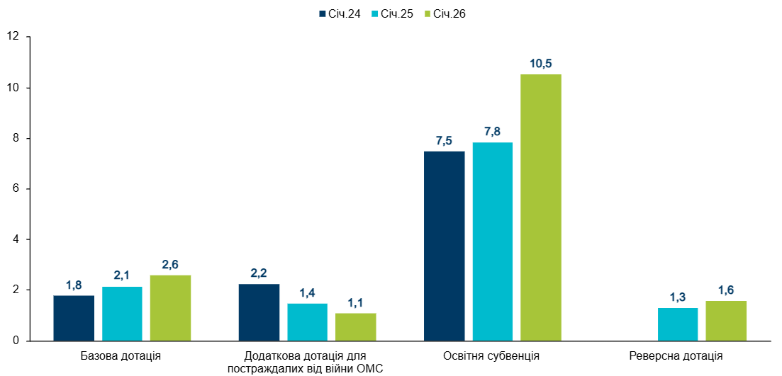 У січні 2026 року Уряд забезпечив перерахування міжбюджетних трансфертів місцевим бюджетам на 43,2% більше за січень 2025 року, зокрема базової дотації — на 23,8%, освітньої субвенції — на 34,6%. Зростання освітньої субвенції пов’язане з підвищенням заробітної плати педагогам з 1 січня 2026 року на 30%. Додаткової дотації для ОМС, що зазнали негативного впливу повномасштабної збройної агресії російської федерації, за січень 2026 року надійшло на 21,4% менше, ніж за січень 2025 року. Ця дотація має вирівняти фінансові диспропорції в місцевих бюджетах, забезпечити стабільні виплати зарплат у бюджетній сфері та компенсувати втрати доходів громад, спричинені російською агресією. Розподіл дотації здійснюється щоквартально на основі фактичних втрат доходів (ПДФО, податку на майно, єдиного податку).
