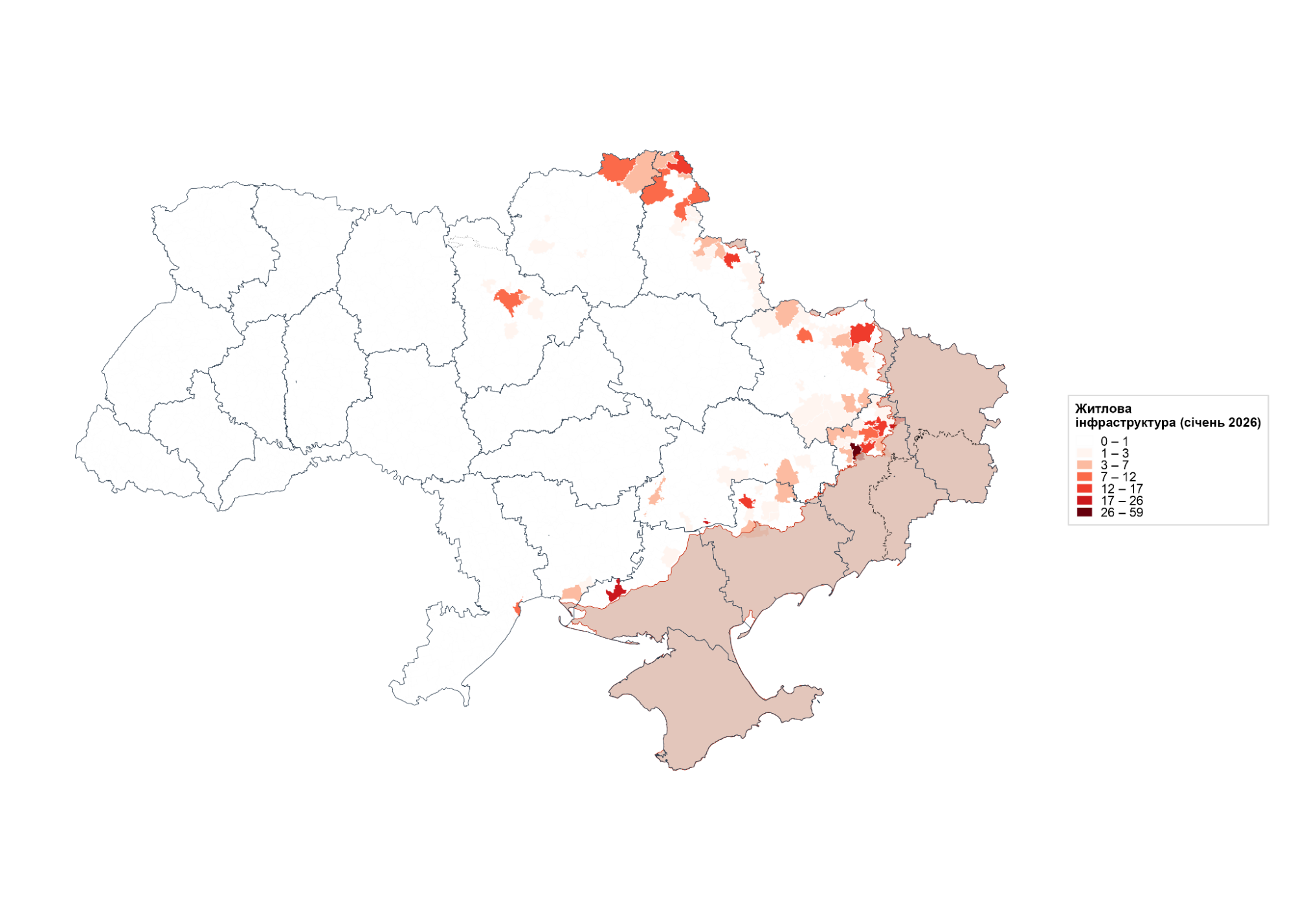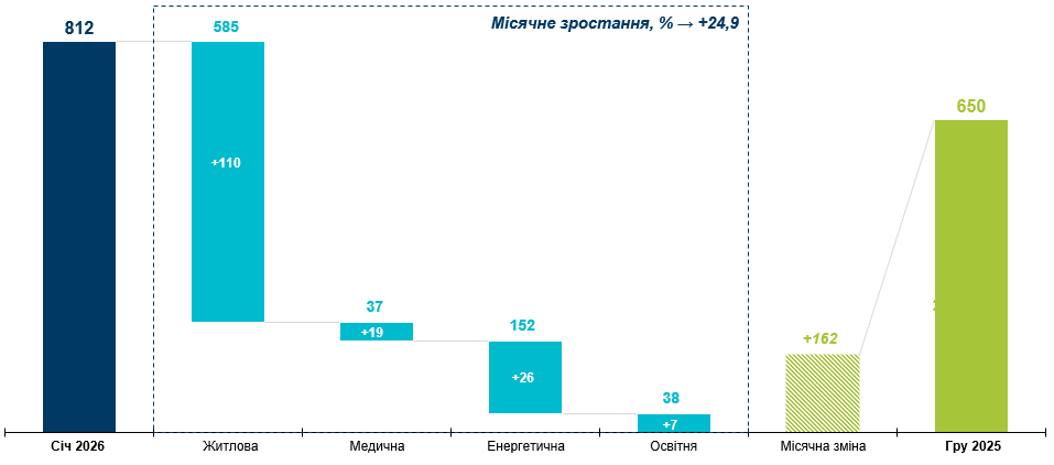 Пошкодження цивільної інфраструктури громад у січні 2026 року суттєво виросли, що свідчить про збереження високих ризиків для місцевої економіки та доступу населення до базових послуг. Упродовж місяця зафіксовано 812 випадків пошкодження у 167 громадах, що на 25% більше, ніж у грудні 2025 року. Найбільше постраждала житлова інфраструктура – 585 випадків (72,1%), тоді як пошкодження енергетичної інфраструктури становили 152 випадки (18,7%), освітньої – 38 випадків (4,7%), а медичної – 37 випадків (4,6%).
