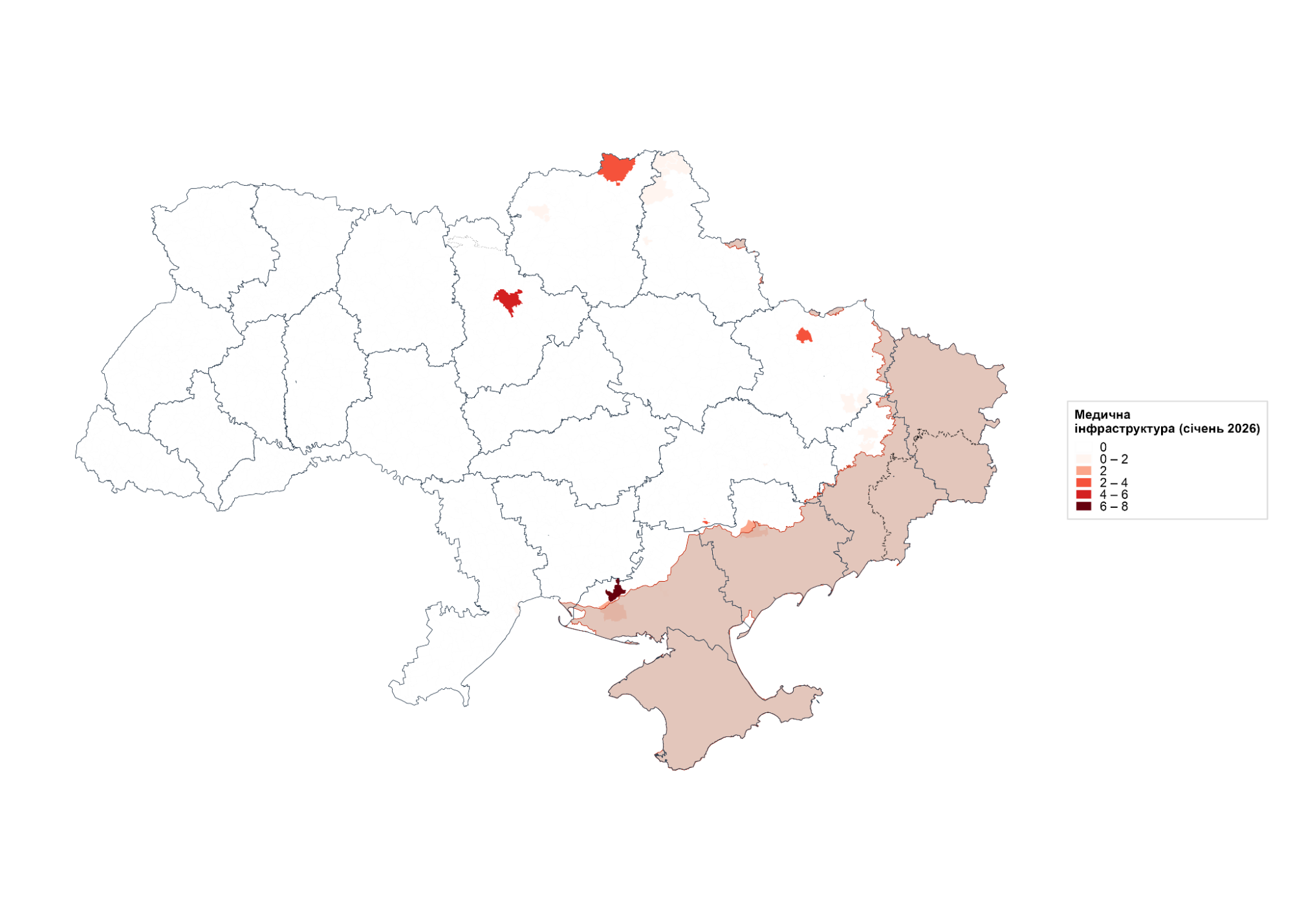 Пошкодження медичної інфраструктури в січні залишалися значними та нерівномірно розподіленими між громадами. Упродовж місяця зафіксовано 37 випадків обстрілів медичних закладів у 20 громадах. Найбільше постраждала Херсонська область – 10 випадків або 27% від загальної кількості, що є найвищим показником серед регіонів і типів інфраструктури. Херсонська громада зазнала 7 ударів, що є найбільшим показником серед усіх громад країни, Київ – 4, а Нікопольська, Харківська та Семенівська громади — по 3 кожна. Водночас у Херсонській області частка пошкоджень, що припадають саме на медичну інфраструктуру, становила 16,7%, що суттєво перевищує середній показник 4,6% по країні і вирізняє регіон на тлі інших областей.
