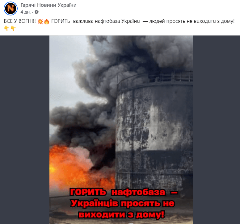 Однак це неправда. В Україні не горіла нафтобаза, фото, яке додали у дописі, — пожежа на нафтобазі «Роснефти» у Білгородській області рф 1 квітня 2022 року.