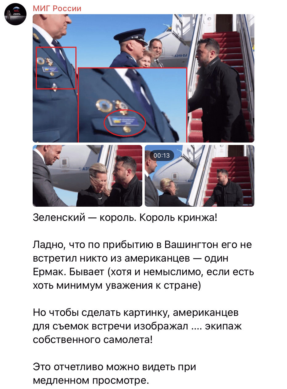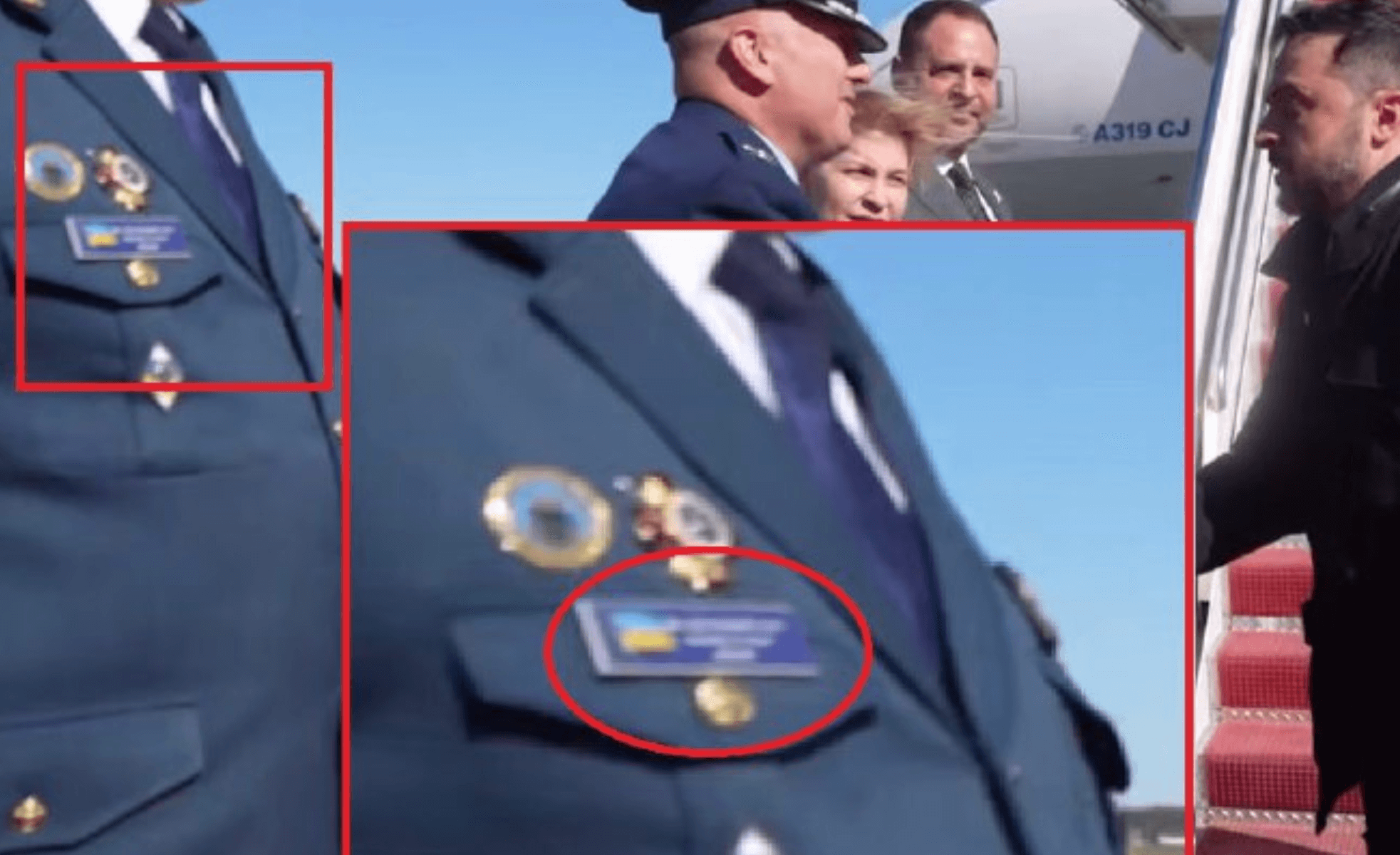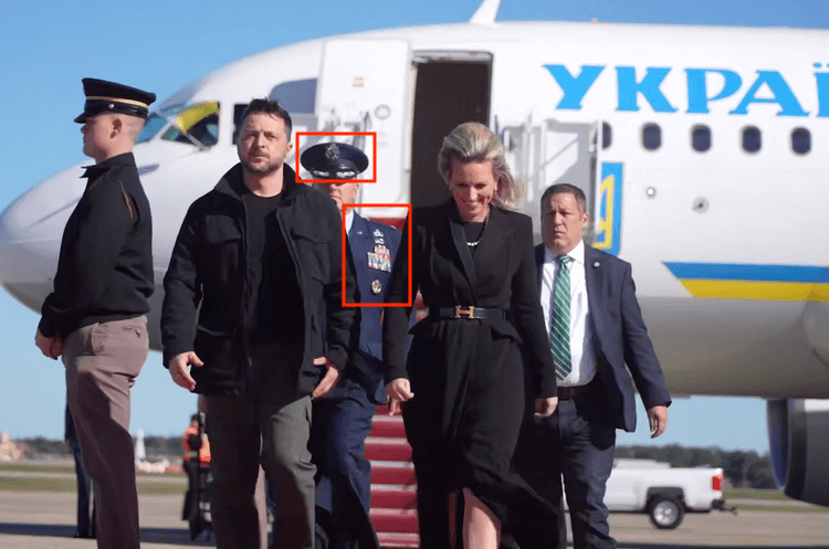 Це добре видно на наступному кадрі, де офіцер іде за Володимиром Зеленським. Його вбрання має всі характерні ознаки форми ВПС США: тканина синього кольору, значно темнішого за форму Повітряних сил України, інший крій кітеля та вигляд кашкета. На формі також можна побачити американські знаки розрізнення. Саме такий однострій офіцери ВПС США носять під час офіційних і протокольних церемоній, зокрема при зустрічі високопосадовців на військових базах.