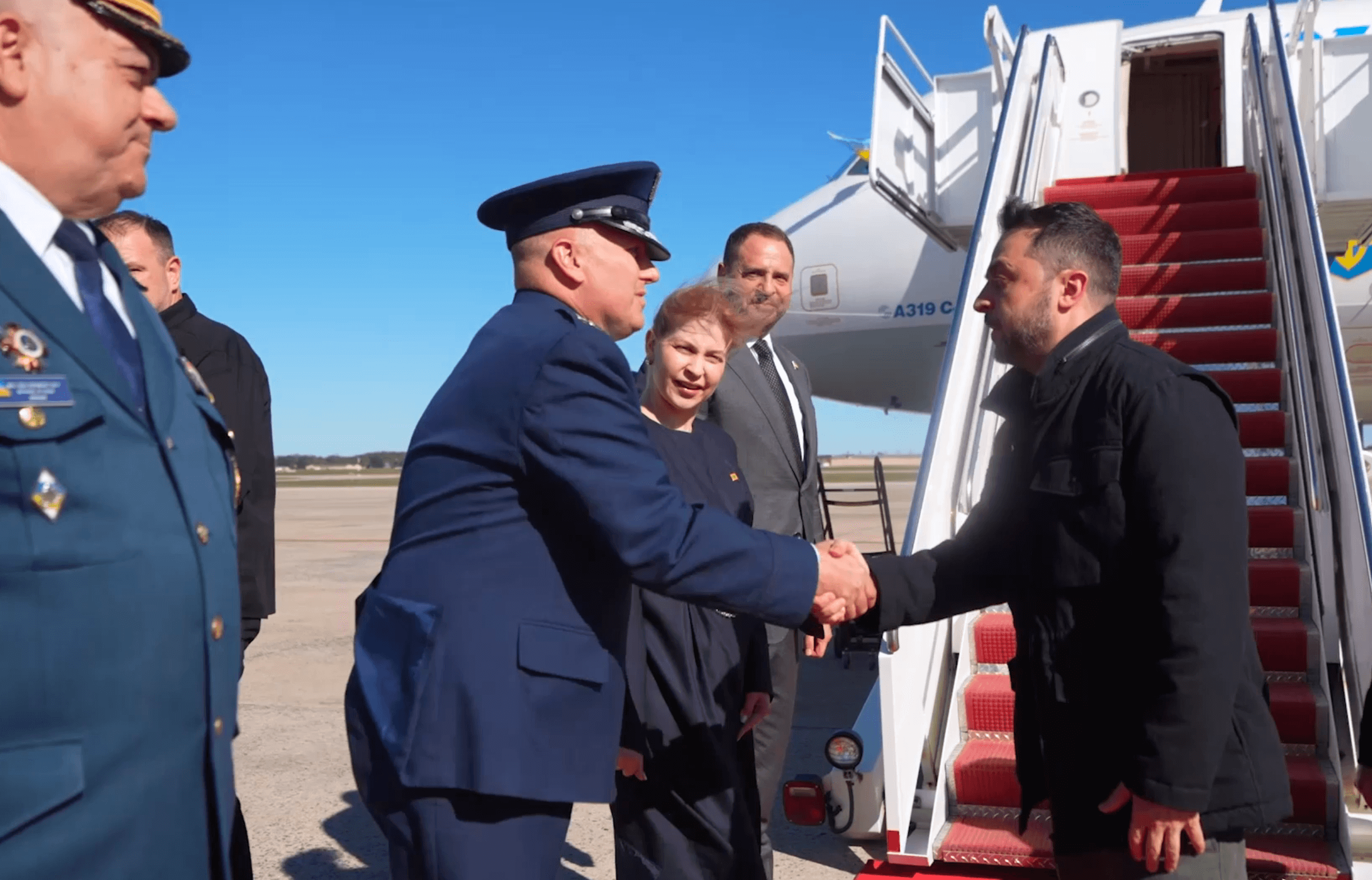 Біля трапа Зеленського зустріли двоє військових, і на тому, який потиснув руку президентові першим, — уніформа Військово-повітряних сил США.
