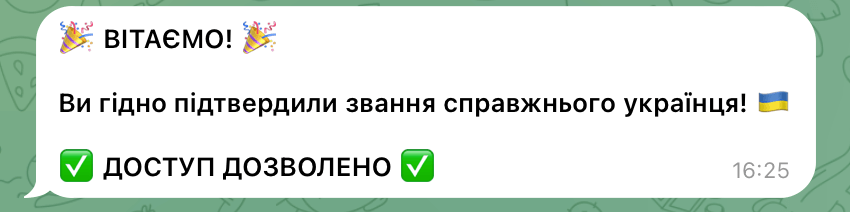 Попри те, що нам не вдалося відповісти на жодне з запитань «тесту», ми, як повідомив бот, склали тест і отримали «звання справжнього українця», а також доступ до каналу, в якому мало бути пророцтво. Врешті-решт, до каналу нас додали лише наступного дня. Ми не знайшли там жодної згадки про пророцтва в історії публікацій.