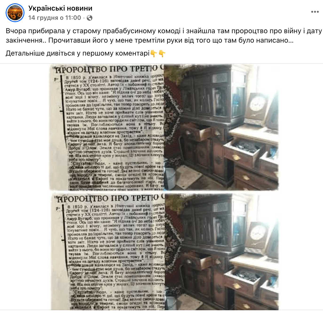 Користувачі соціальних мереж поширюють фотографію газети з текстом «пророцтва про війну і дату її закінчення». У дописах закликають переходити за посиланням у коментарях, аби дізнатися деталі.