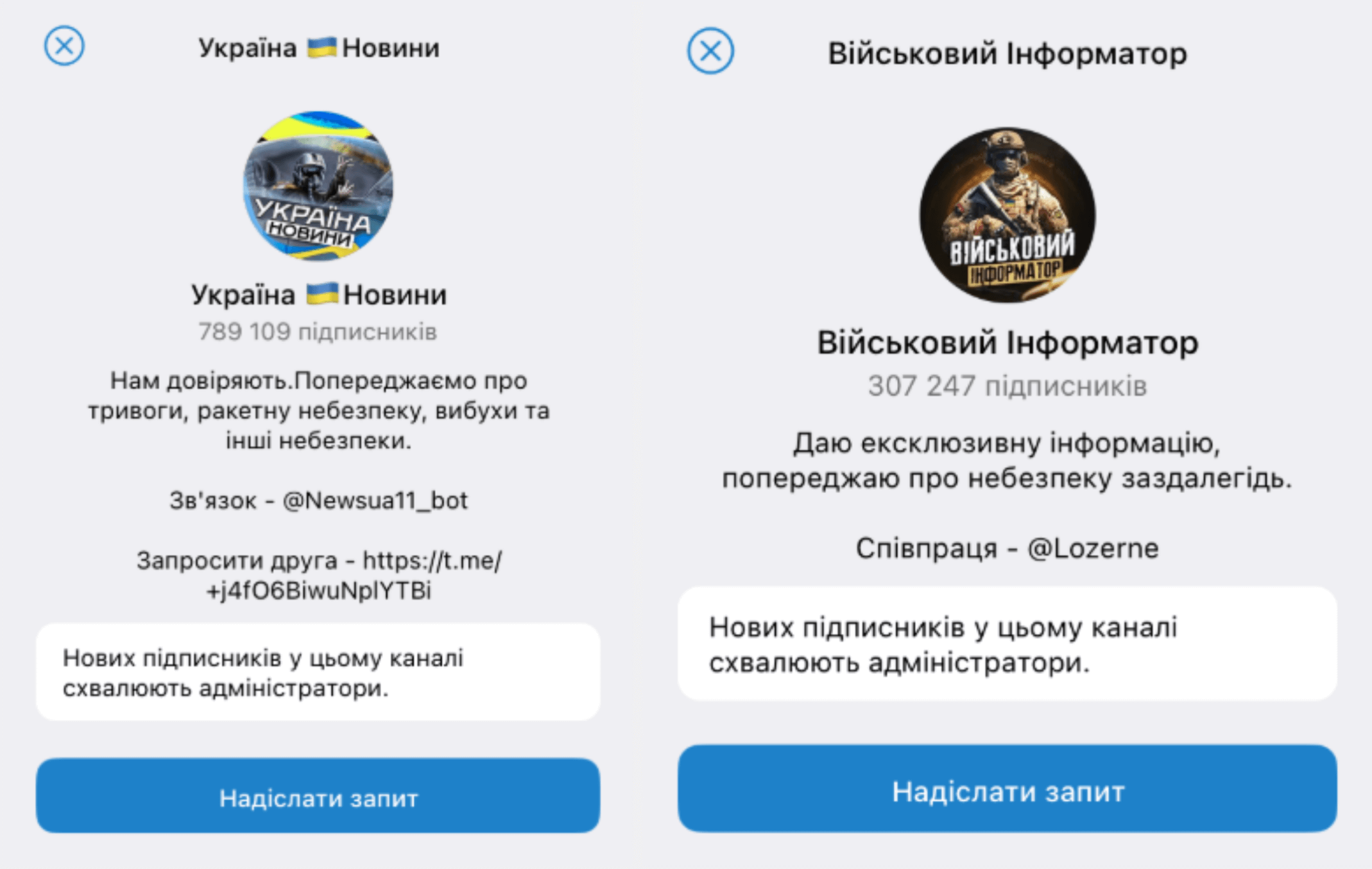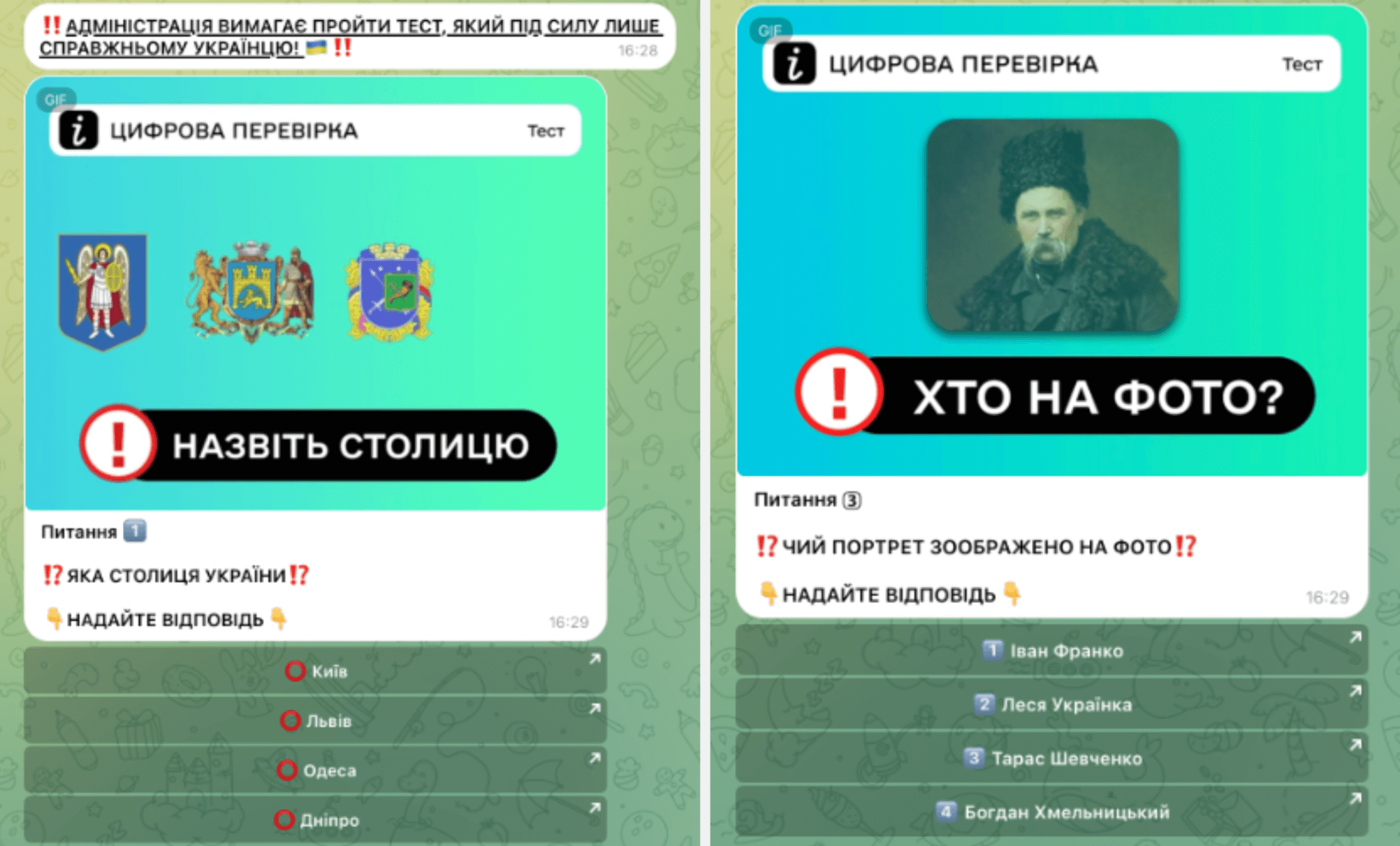 Ми подали заявку на приєднання, і відразу після цього бот-адміністратор каналу надіслав в особисті запитання «тесту на справжнього українця», пройшовши який, ми змогли б доєднатися до каналу. Показово, що в оформленні «гіфок» використали символ інформації і шрифт у стилі дизайну Дії. Це, найімовірніше, для того, аби замаскуватися під ініціативу Дії або принаймні викликати візуальну асоціацію із державним продуктом, а отже, не зійти за шахрайство.
