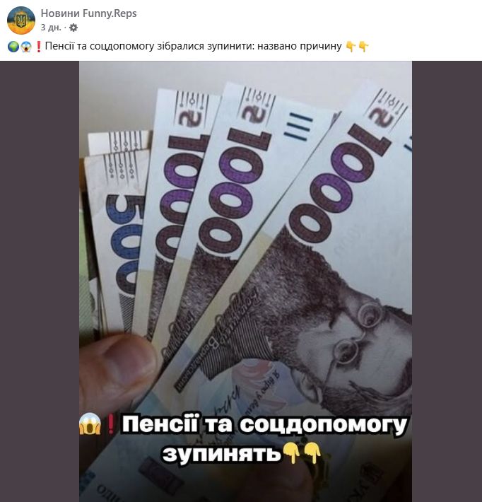 Отже, пост про зупинку виплат пенсій та соціальної допомоги — типовий приклад клікбейту. Його мета — викликати сильну емоційну реакцію у користувачів і спонукати їх перейти за посиланням, де міститься зовсім інша інформація.