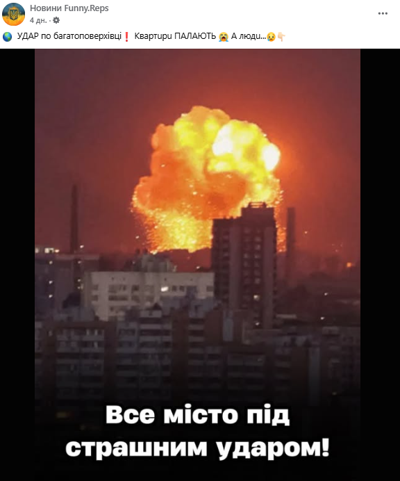 Однак це неправда. На фото — момент удару під час російського обстрілу Києва 2 вересня 2024 року, а не 10 жовтня 2025.