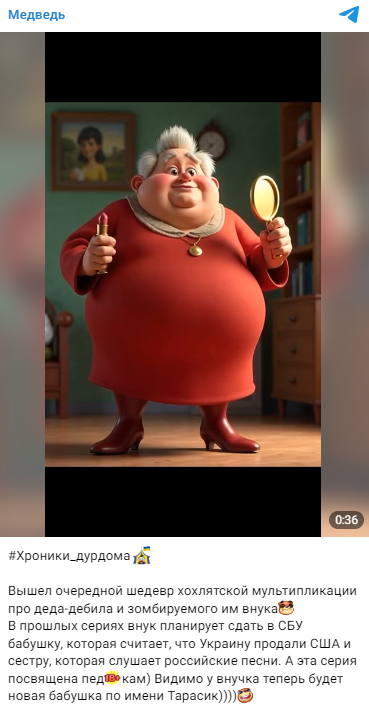 У мережі поширюють нібито нову серію мультфільму, який створили в Україні. У цьому епізоді дід розповідає онуку, що Україна — це європейська країна, яка підтримує західні цінності, зокрема відкрите кохання між двома чоловіками та Марші рівності. На репліку онука, що бабуся вважає ЛГБТ-представників збоченцями, дід відповідає, що вона наслухалася російської пропаганди.