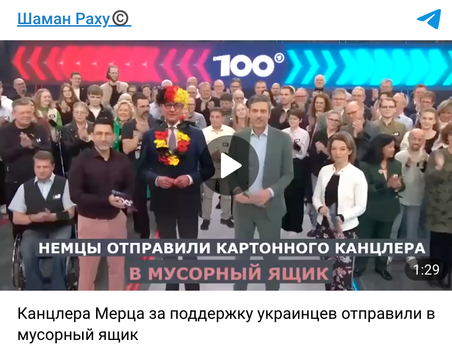 Це неправда. У відео об’єднали нарізки з двох різних німецьких токшоу. У жодному з них не викидали картонну фігуру Мерца через підтримку України.