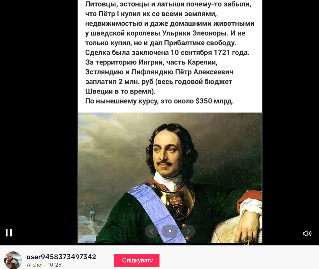 У мережі поширюють інформацію, нібито 10 вересня 1721 року російський імператор Петро І купив у шведської королеви Ульріки Елеонори латвійців, литовців, естонців з усіма землями та нерухомістю, і дав їм свободу. За територію тодішніх Інгрії, частину Карелії, Естляндії та Ліфляндії від буцімто заплатив 2 млн рублів.