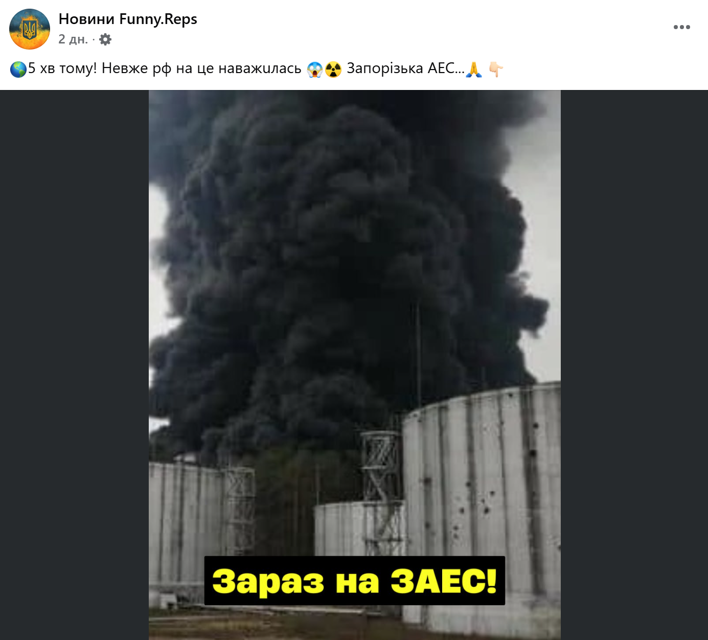 Це неправда. На фото зображена нафтобаза у Чернігові, по якій росіяни влучили 3 березня 2022 року. Вибуху на ЗАЕС не було, хоча ризик зберігається через російські провокації.