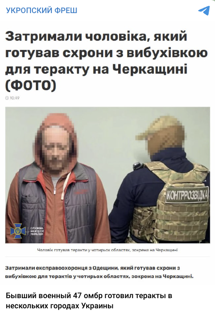 У мережі поширюють інформацію, нібито СБУ затримали військового 47-ї окремої механізованої бригади (ОМБр), який готував теракти у чотирьох містах України. Мовляв, СБУ не вказали, що це був військовий, а назвали його охоронцем у торговому центрі.