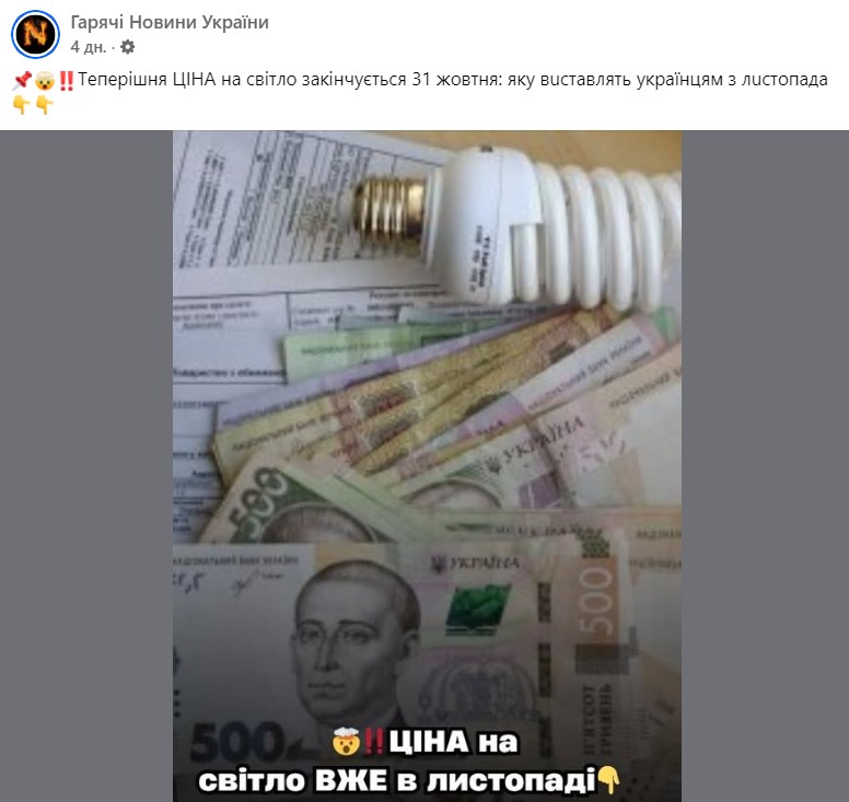 Про це ж йдеться у статті, посилання на яку додане першому коментарі під дописом про нібито зміну вартості електроенергії. У матеріалі чітко вказують: «Міністерство енергетики заявило, що ніякого підвищення тарифів на електроенергію для населення після 31 жовтня не планується».