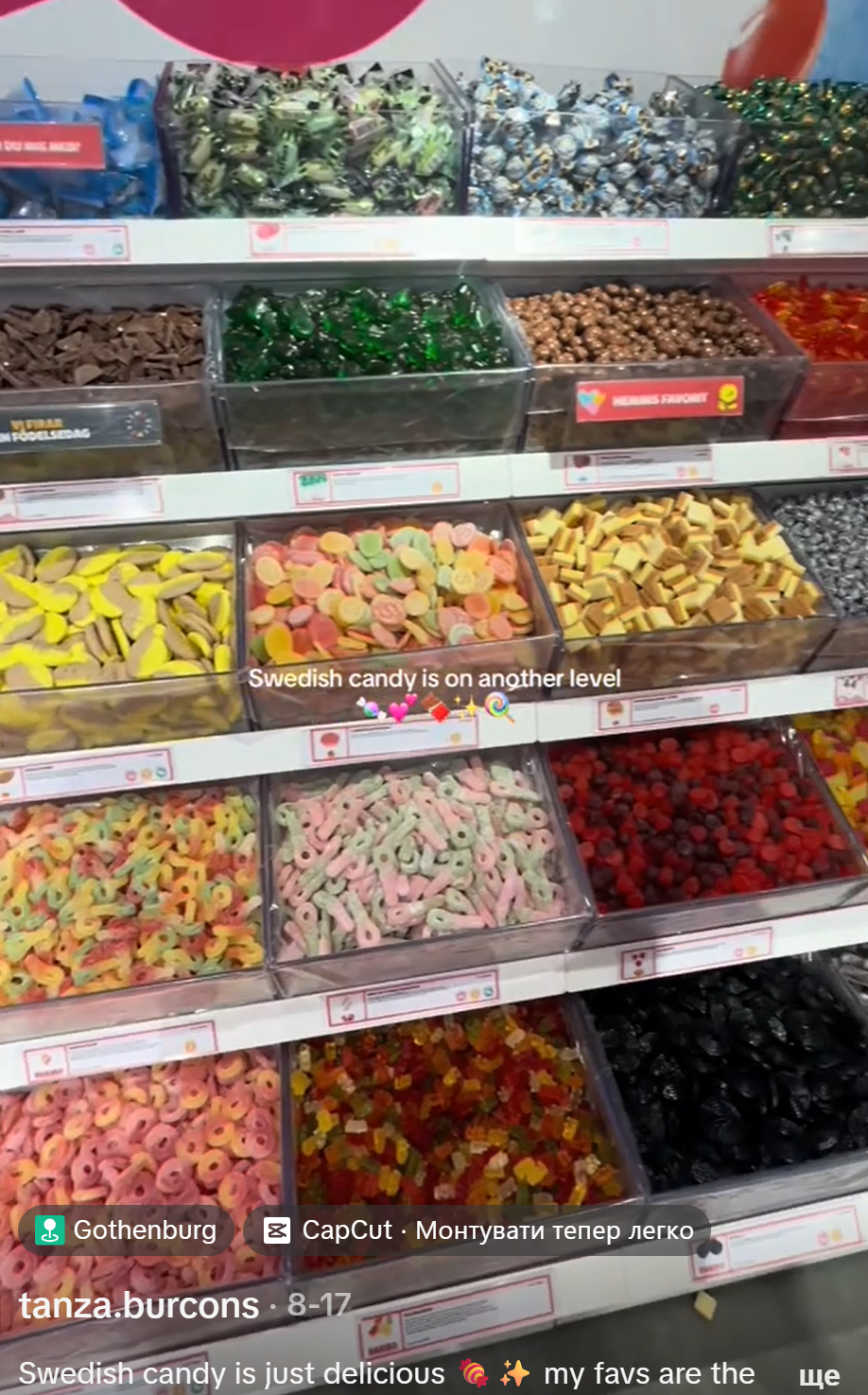 Нам не вдалося знайти першоджерело цього ролика. Однак його, найімовірніше, зняли у Швеції. За зворотним пошуком ми знайшли подібні фото та відео із магазинів цукерок, які викладені у чотири ряди. У Швеції навіть є традиція щосуботи водити дітей у такі магазини та купувати желейні цукерки.