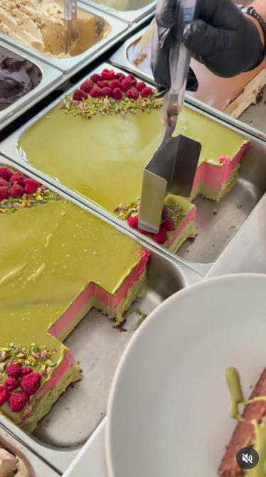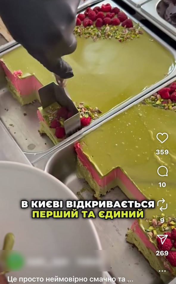 На перших кадрах показують фісташкове морозиво з малиною. Оригінальне відео належать італійському кафе Eatalio в Йорданії. Цей заклад не має філій у Києві.