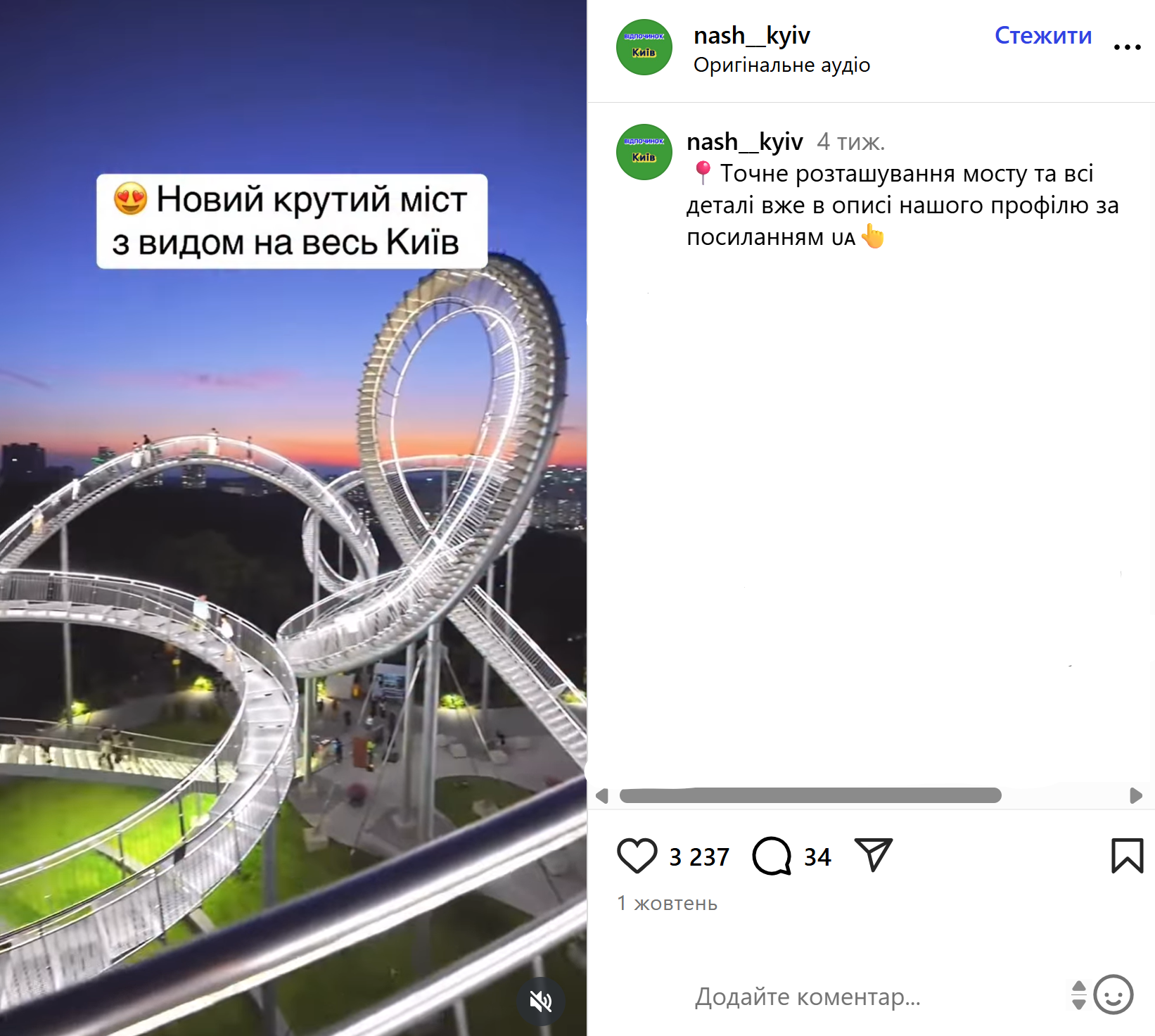 У мережі поширюють інформацію, буцімто у Києві відкрили новий міст із підсвіткою та краєвидом на усе місто. Як «доказ» додають відео з моста.