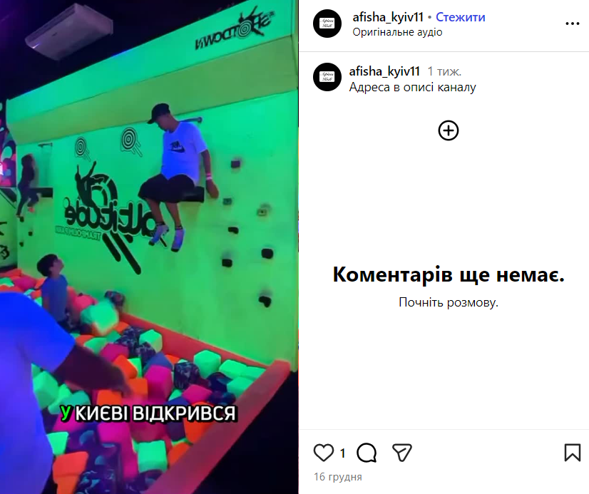 Допис про батутний парк у Києві поширив акаунт «Afisha_kyiv11». У ньому регулярно публікують відео з різних закладів та локацій світу, видаючи їх за київські. У підписі до відео користувачів закликають перейти за посиланням до закритого телеграм-каналу, де нібито можна дізнатися адреси цих місць, однак цієї інформації там немає.