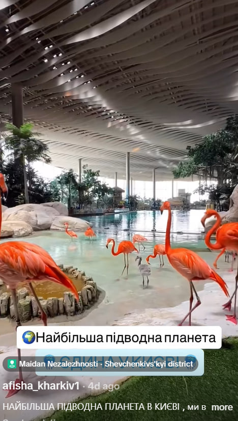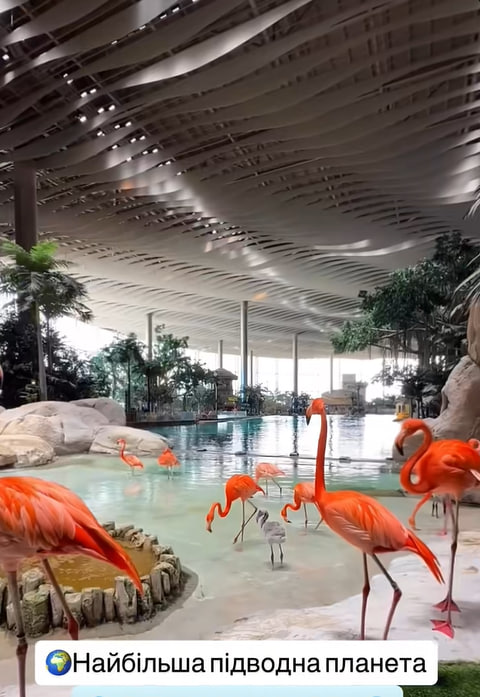 За зворотним пошуком у гуглі ми з’ясували, що океанаріум на відео — це тематичний парк морських тварин і центр дослідження, порятунку та реабілітації тварин SeaWorld в Абу-Дабі (ОАЕ). Так, деякі зони парку мають ідентичний антураж. Наприклад, у павільйоні з фламінго та сама хвиляста стеля, водойма, рослини, великі кам’яні конструкції.