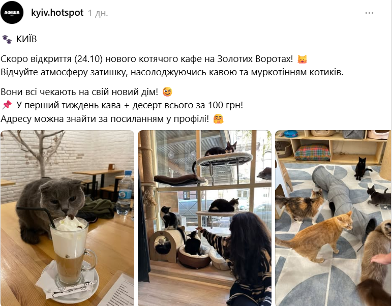 Користувачі соцмереж повідомляють про відкриття «котячого кафе» на Золотих воротах у Києві. У дописі закликають перейти за посиланням в описі профілю, де має бути зазначена адреса кав’ярні.