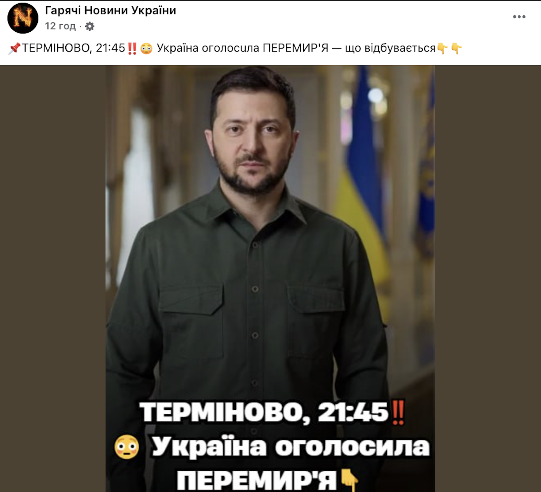 У соцмережах поширюють інформацію, буцімто Україна оголосила перемир’я. До повідомлення додають фото президента Зеленського, що створює враження, ніби йдеться про завершення війни з росією.