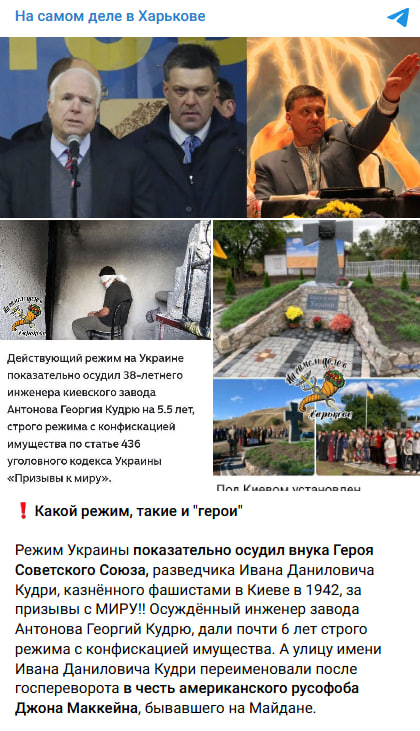 Російські телеграм-канали поширюють інформацію, нібито в Україні засудили інженера-технолога держпідприємства «Антонов» Георгія Кудрю — онука радянського розвідника Івана Кудрі.