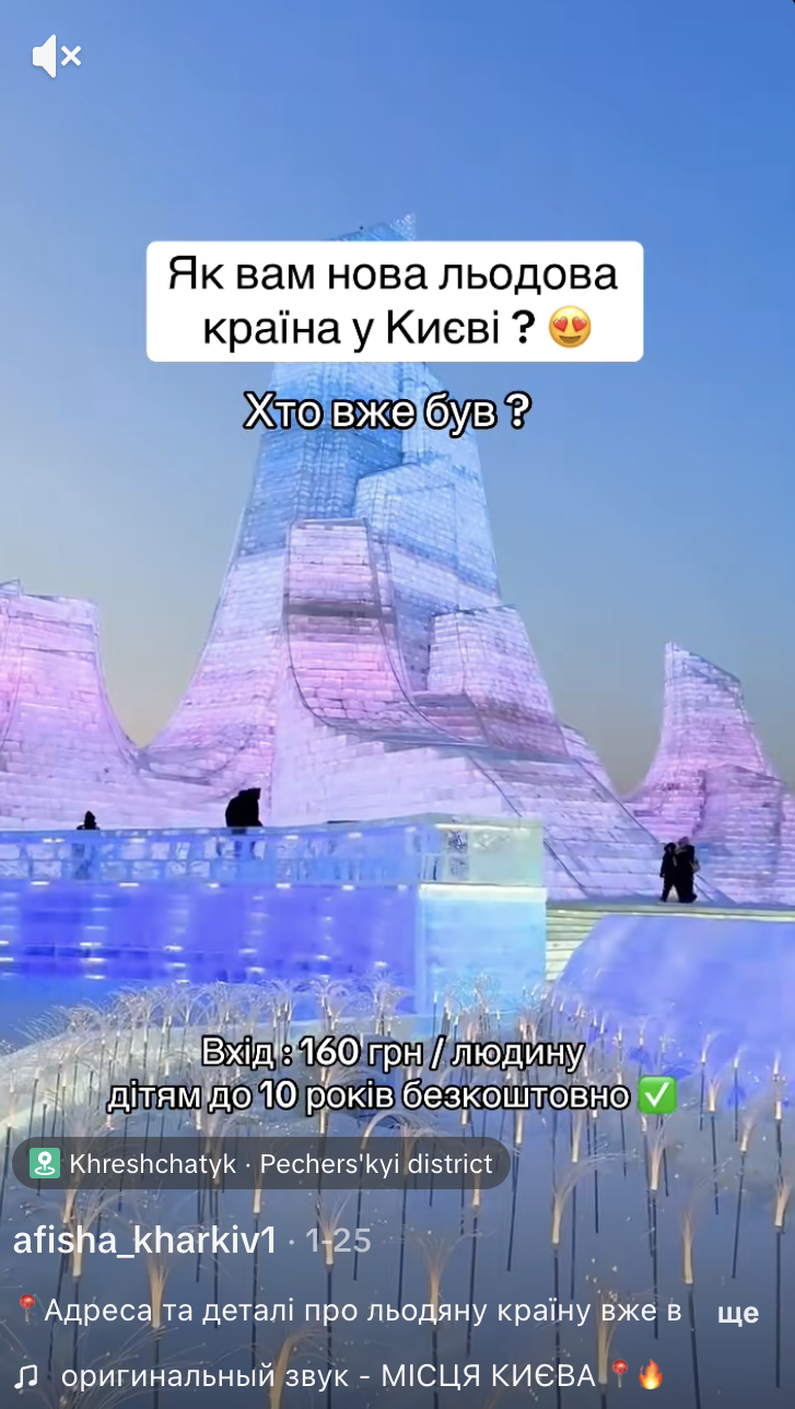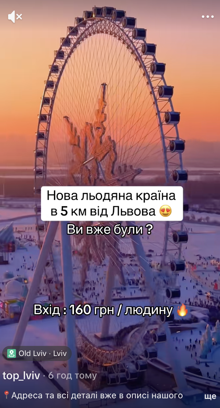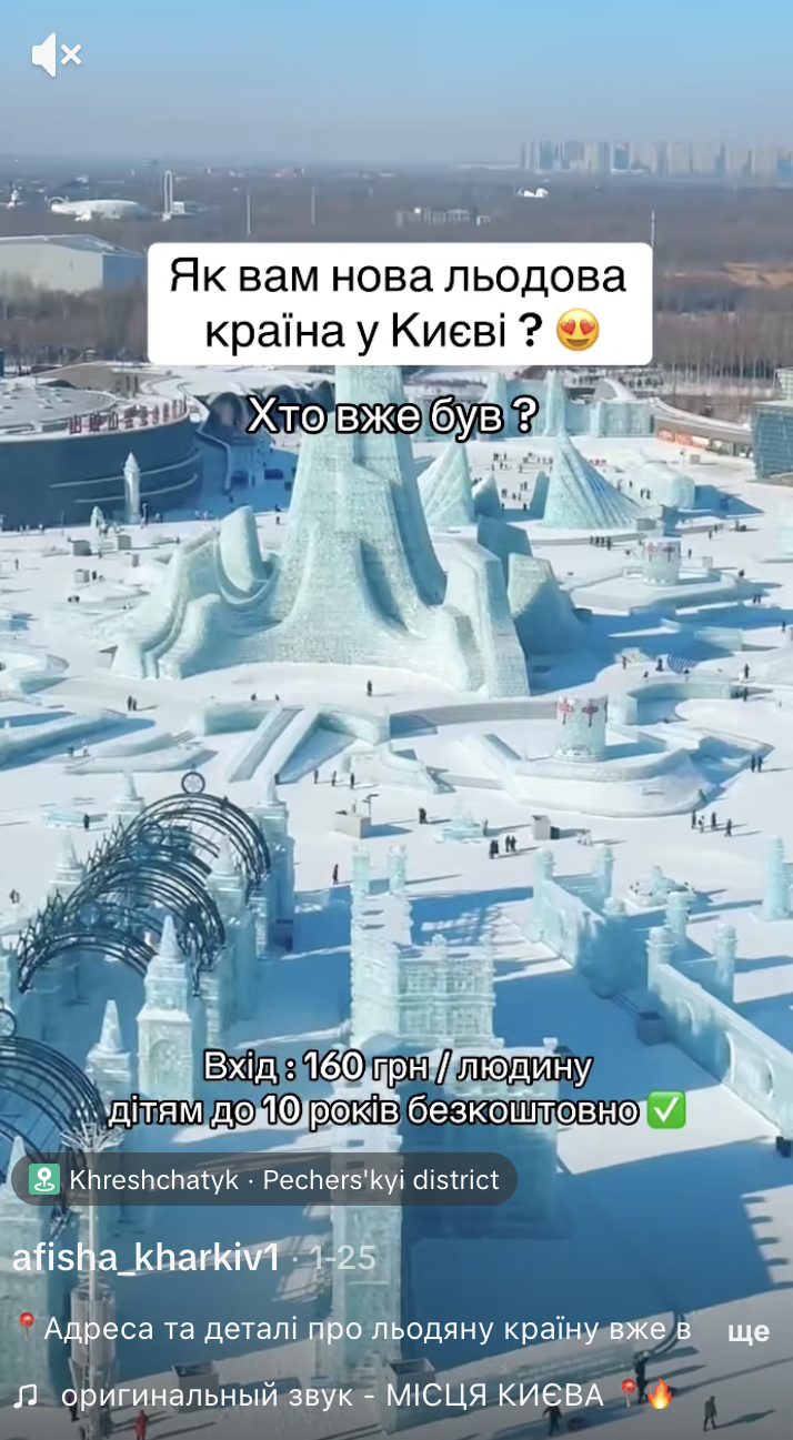 У мережі поширюють відео про нібито відкриття льодової країни в різних українських містах, наприклад, у Львові чи Києві. Щоб дізнатися точне розташування, пропонують перейти за посиланням у шапці профілю, який поширив допис.