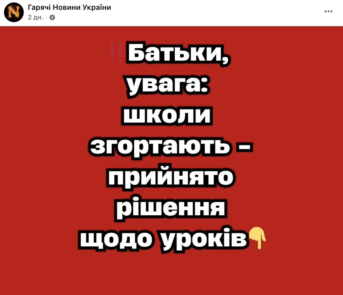 Цей пост із гучним заголовком про «згортання всіх шкіл» є типовим прикладом клікбейту. Його мета — викликати паніку та спонукати користувачів перейти за посиланням. Подібні анонімні сторінки часто поширюють перекручену або неправдиву інформацію, намагаючись збільшити охоплення. Раніше ми вже спростовували схожий фейк з цих джерел, як-от нібито в українські школи переходять на шестиденний режим навчання.
