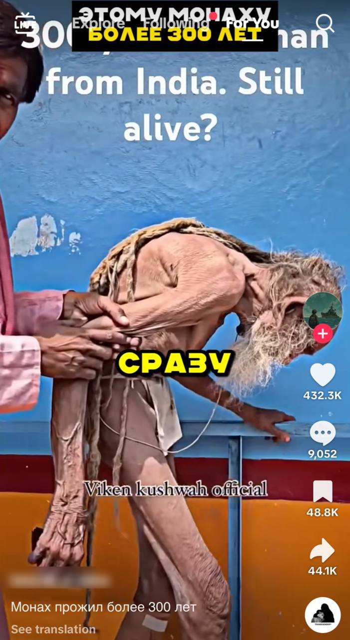 У мережі поширюють відео із тибетським монахом, якому буцімто майже 300 років. Стверджується, що його знайшли в одній із печер Індії. Під час медичного огляду з’ясувалося, що чоловік важить 30 кг, не має жодних хвороб, може нормально ходити та розмовляти.