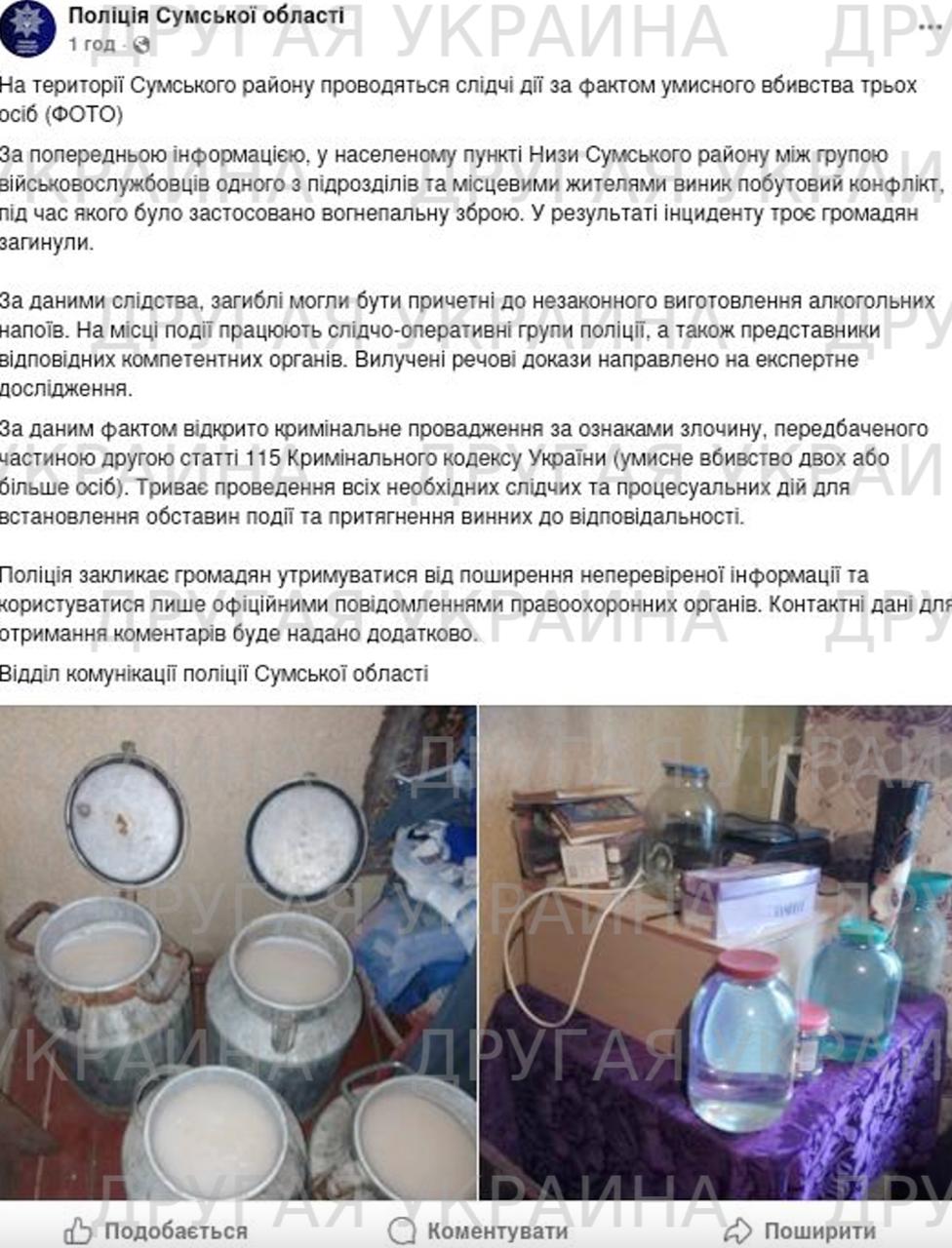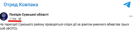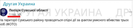Російські телеграм-канали поширюють скриншот нібито допису Нацполіції Сумської області. У ньому йдеться про вбивство військовими 95-ї окремої десантно-штурмової Поліської бригади (ОШБр) трьох людей на Сумщині. Стверджують, що згодом Нацполіція нібито видалила пост.