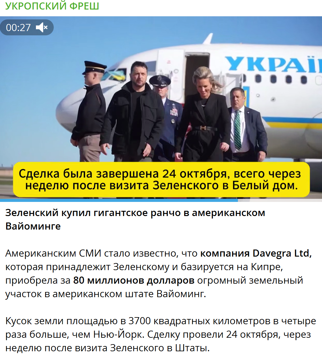 Російські телеграм-канали поширюють запис нібито американських медіа, у якому стверджують, що Володимир Зеленський буцімто придбав ранчо (ферму для розведення рогатої худоби) за $80 млн в американському штаті Вайомінг. Угода начебто відбулася 24 жовтня 2025 року, і уклали її через компанію Davegra Ltd, яка належить Зеленському.