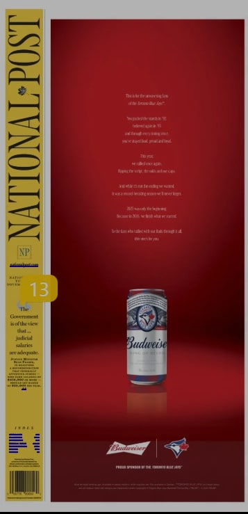 На обкладинці випуску канадського журналу «National Post» за 4 листопада 2025 року насправді зображена реклама пива Budweiser, присвячена фанатам бейсбольної команди Toronto Blue Jays.