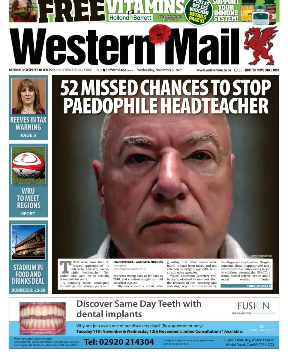 У випуску британської газети «Western Mail» від 5 листопада 2025 року йдеться про затримання директора британської школи, якого звинувачують у педофілії.