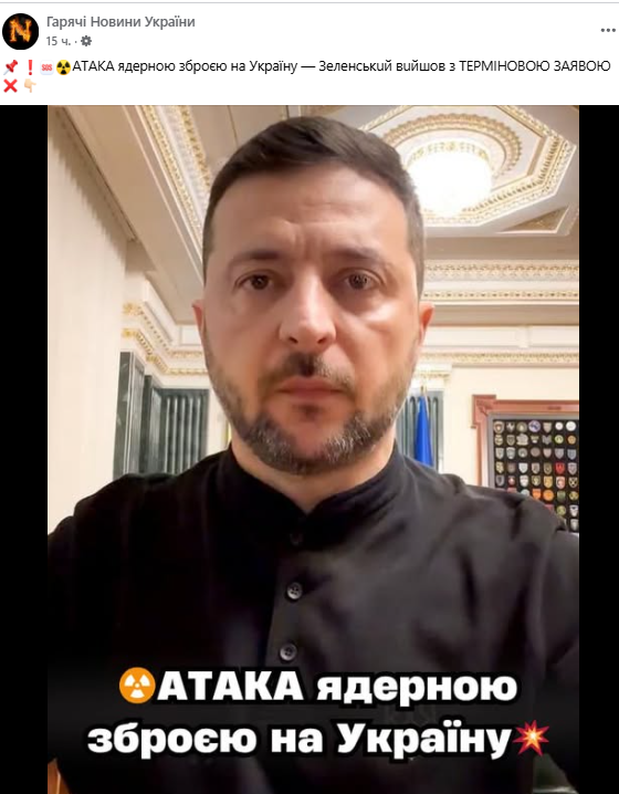 У мережі поширюють новину, буцімто Зеленський зробив термінове звернення щодо атаки ядерною зброєю росії проти України.