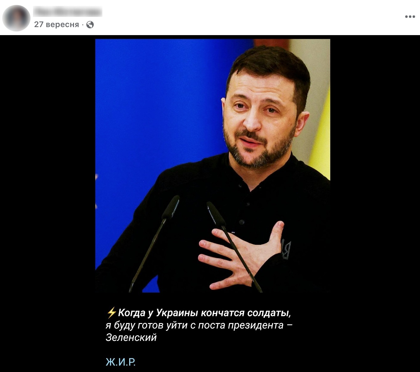 Утім, це неправда. Зеленський не заявляв, що піде з поста президента, коли в Україні закінчаться солдати.