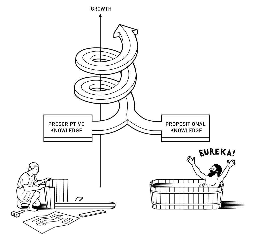 До Промислової революції інновації здебільшого ґрунтувалися на нормативному знанні – люди знали що працює, але не чому. Пропозиційне ж знання розвивалося ізольовано, а тому не давало реальних результатів (як-от спроби побудувати вічний двигун). Промислова революція почалася не просто через винаходи машин, а через «культуру інновацій», коли стався зсув у бік пошуку нових рішень, а не практики триматися старих.