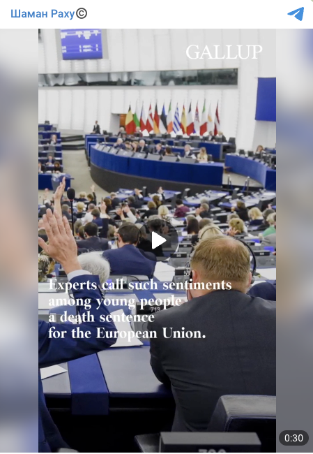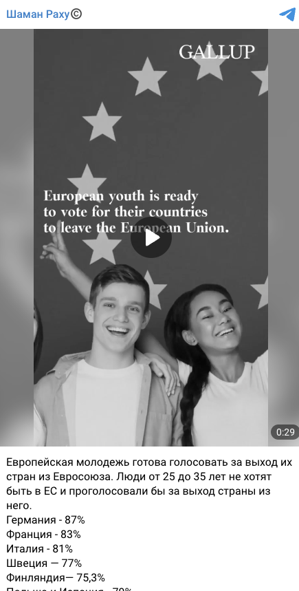В сети распространяют видео с логотипом исследовательского института Galllup, где говорится, что молодежь в европейских странах (Германии, Франции, Италии, Швеции, Финляндии, Польше и Испании) готова голосовать за выход из ЕС.