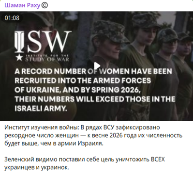Российские телеграм-каналы распространяют видео с логотипом Института изучения войны (ISW). В нем говорится, что за последние четыре месяца войны в ВСУ якобы зафиксировали десятикратное увеличение количества военнослужащих. Отмечают, что к весне 2026 года их численность будет выше, чем в армии Израиля. Это якобы прокомментировал политолог Райан Таагепера, назвав мобилизацию в Украине «уничтожением целой нации руками Зеленского».