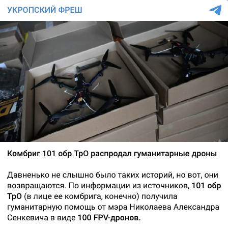 В сети распространяют информацию, что якобы командир 101-й отдельной бригады территориальной обороны (ОБр ТрО) получил дроны в качестве гуманитарной помощи от мэра Николаева, продал их другим бригадам и выставил на OLX.