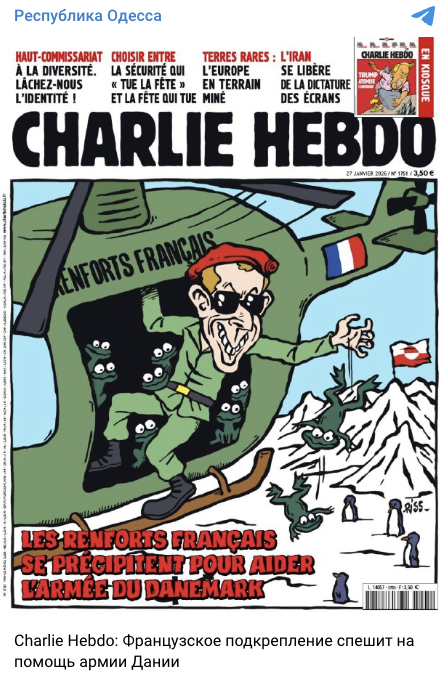 Российские телеграм-каналы распространяют якобы обложку французского сатирического журнала Charlie Hebdo. На ней карикатурно изображена высадка французской армии в Гренландии, вместо военных — лягушки.