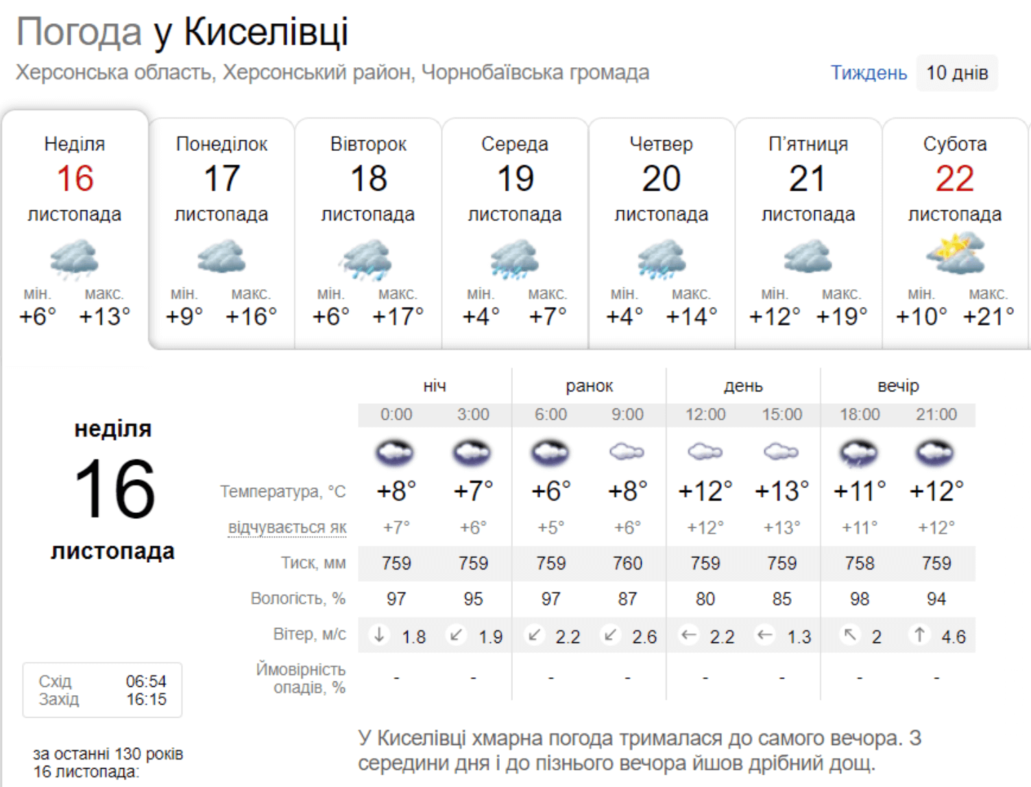 Вверху — прогноз погоды на 16-19 ноября 2025 года в селе Киселевка Херсонской области; внизу — дорога на фейковом видео