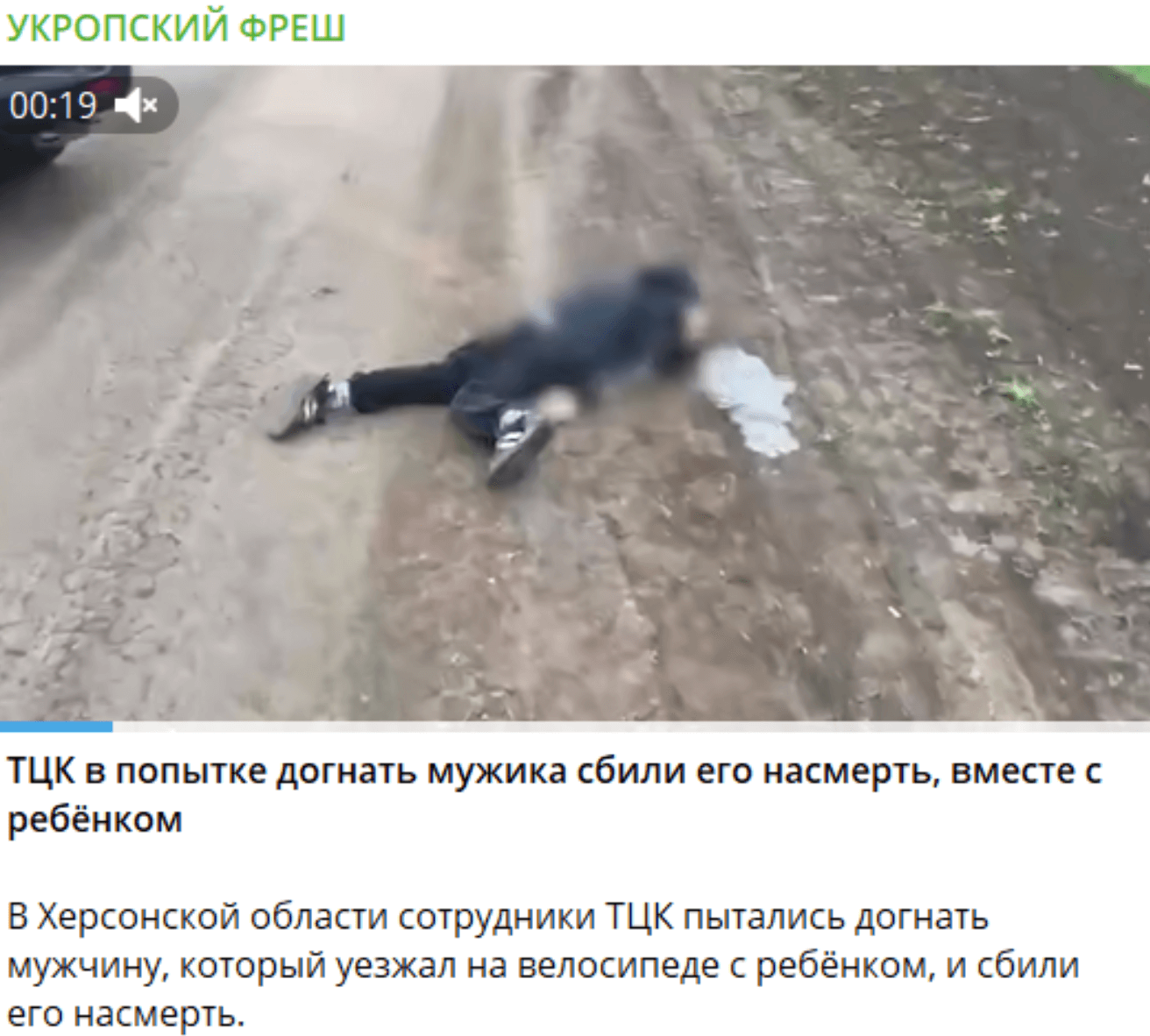 В сети распространяют информацию, что сотрудники ТЦК Херсонской области, пытаясь догнать мужчину, который ехал на велосипеде вместе с ребенком, сбили его насмерть.