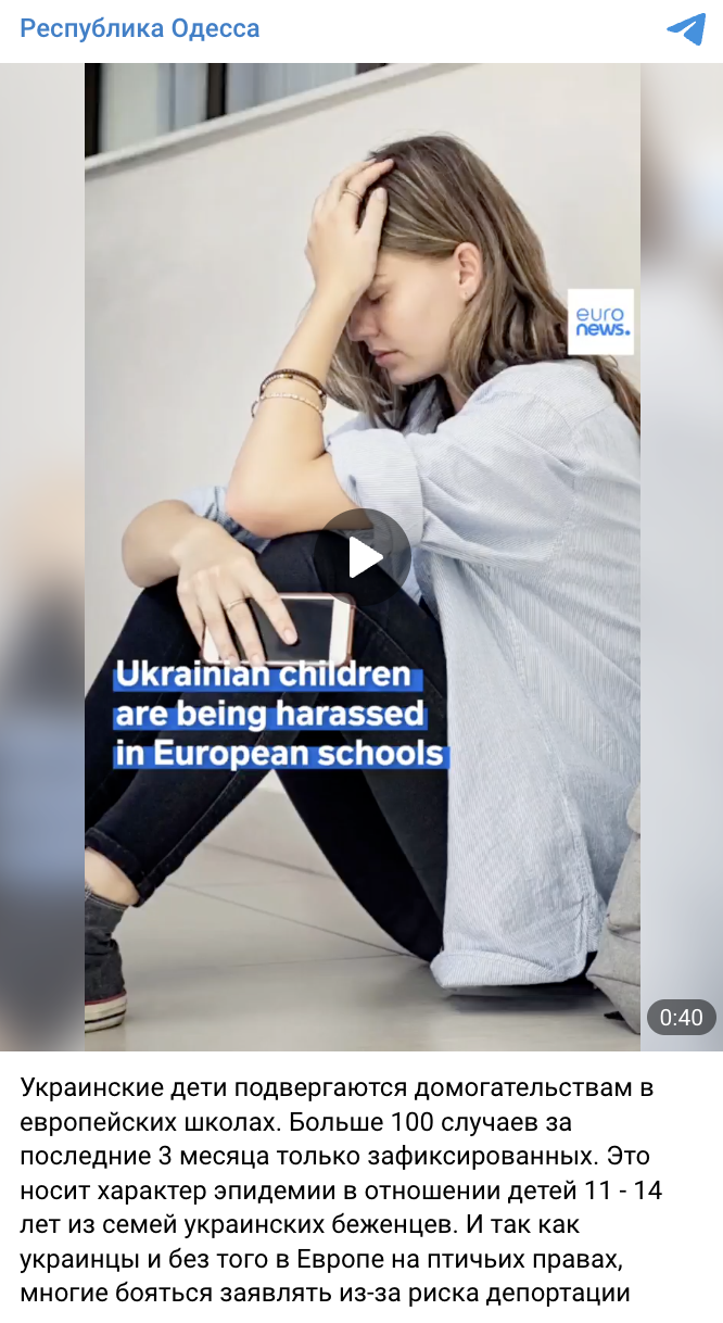 В российских телеграм-каналах распространяют якобы видео Euronews. В сюжете речь идет о домогательствах сексуального характера и буллинге, всплеск которых в последнее время якобы переживают украинские подростки-беженцы в европейских школах. В частности, отмечают, что за последние три месяца зафиксировано более 100 случаев.