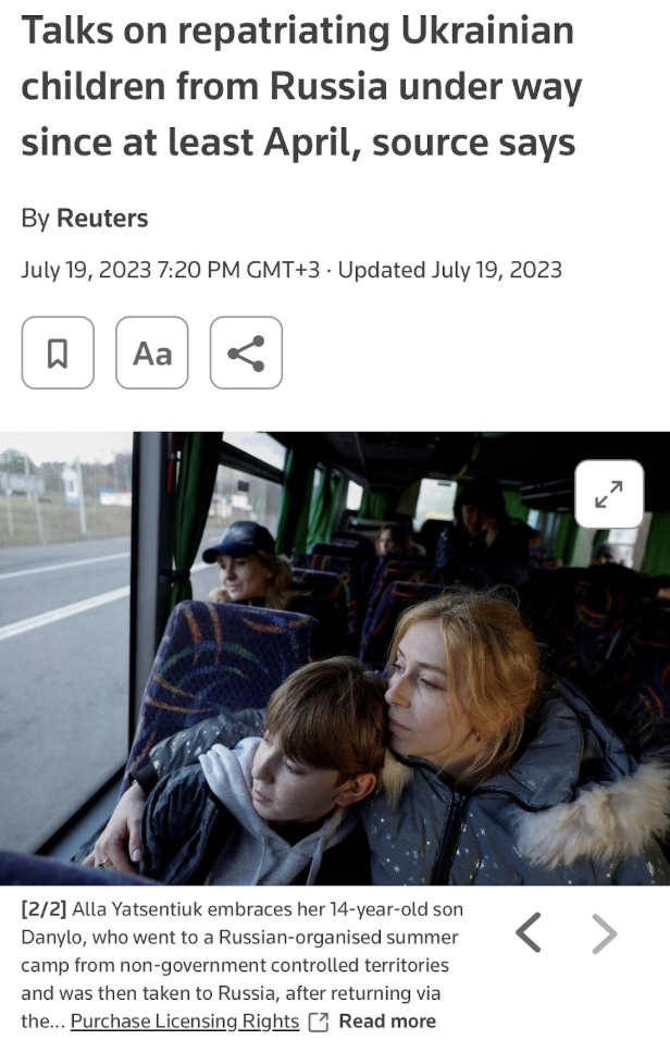 Например, кадр, где женщина обнимает ребенка, взяли из материала Reuters о репатриации украинских детей из россии за 2023 год.