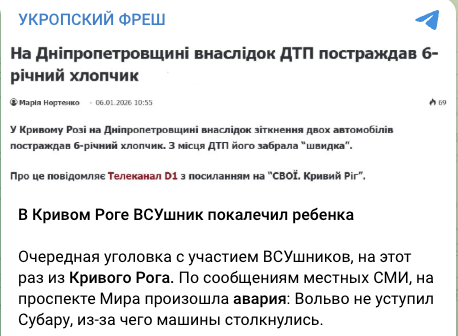 По ключевым словам мы выяснили, что подобная новость действительно существует. 6 января 2026 года телеканал D1 опубликовал новость, что в Днепропетровской области в результате ДТП пострадал 6-летний мальчик. Однако в статье не упоминалось о причастности виновника к 71-й ОЕБр. Другие СМИ также не сообщали, что виновником ДТП является майор Михайлюк, как указано в посте.